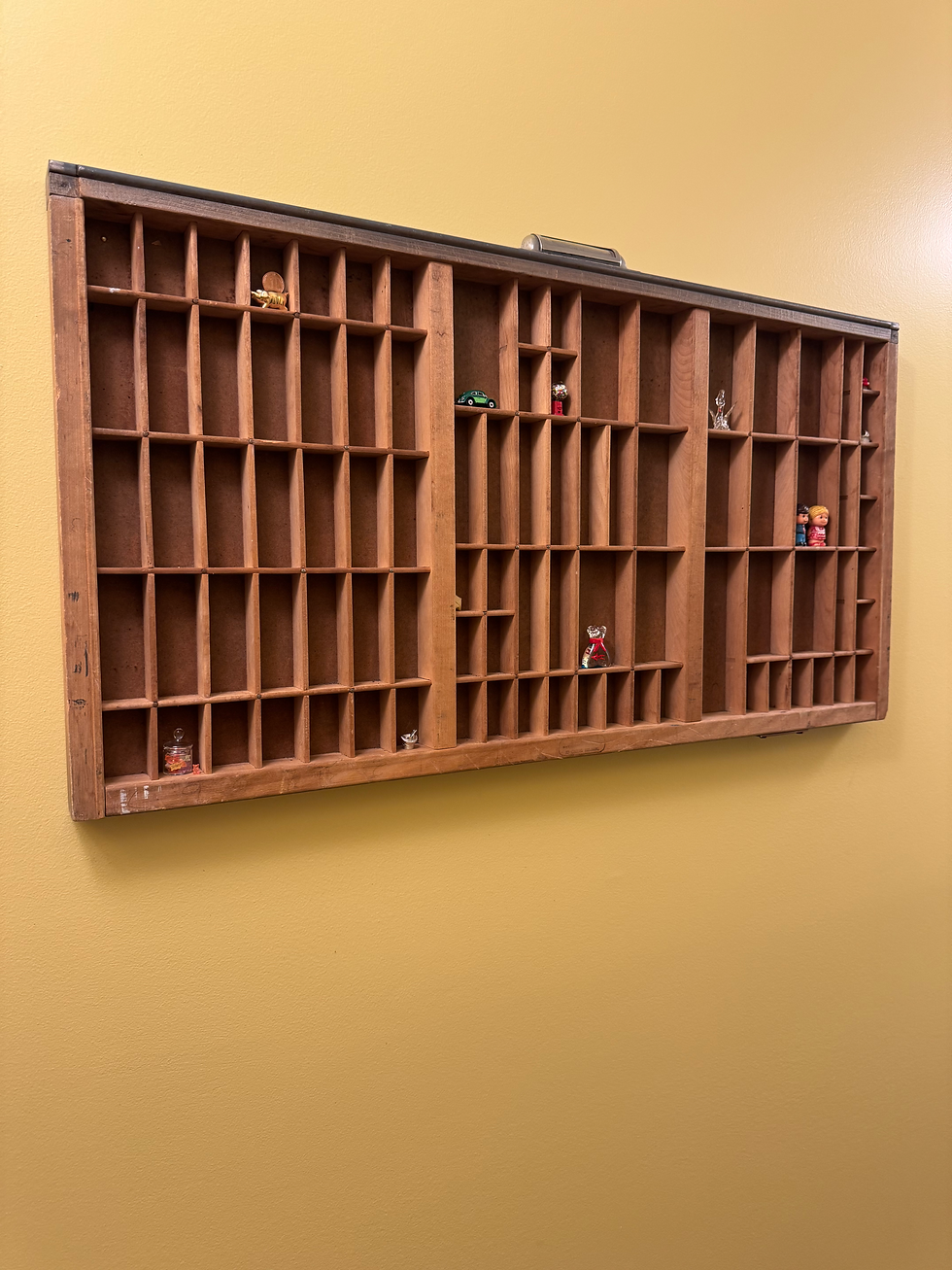 Not long after we moved back into our home, my Mom stopped by with a birthday/housewarming gift. As I tore off the wrapping paper, I saw what looked like another shadow box. It’s actually a drawer from an antique printer’s desk, but it has slots similar to my original shadow box. Each slot in this drawer held a different letter or symbol used in printing. It’s a beautiful piece and I wanted to be excited about this gift from my mom. It was just a little overwhelming, so I tucked it away in the attic until the time was right.